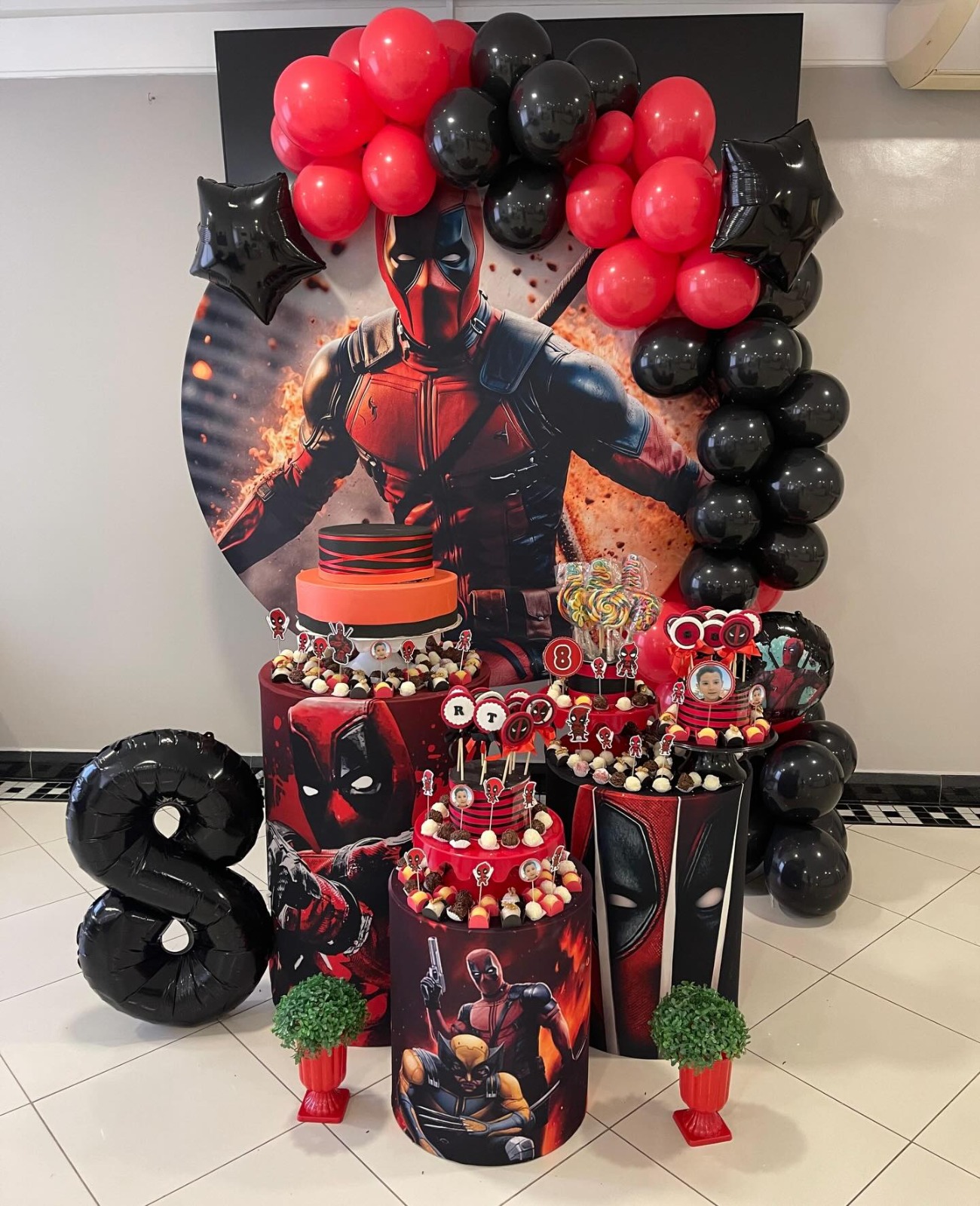 Mini hot-dog, pastelzinho, mini pizza, pipoca, salgadinhos, bolo, doces e decoração.